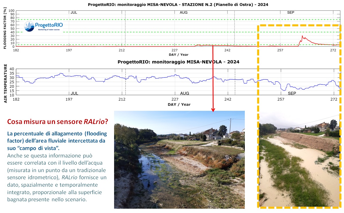 Monitoraggio del fiume Misa (regione Marche, AN) dal ponte sulla strada provinciale Arceviese a Pianello di Ostra, da luglio a settembre 2024 (ProgettoRIO). La traccia rossa del grafico superiore mostra il progressivo allagamento del bacino fluviale conseguente alle piogge del 18-20 settembre (allerta meteo diramata dalla protezione civile).